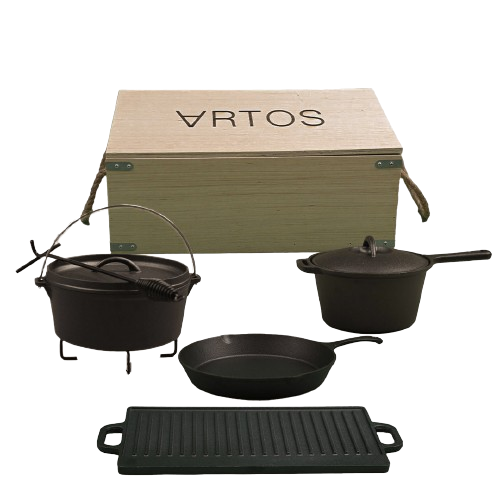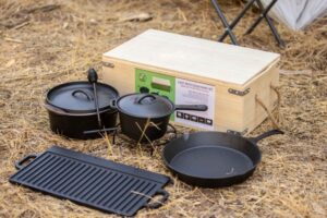ערכת בישול לשטח הכוללת: סיר הולנדי מברזל יצוק, 4.25 ליטר, עם מכסה. סיר לרטבים מברזל יצוק, 2.36 ליטר עם מכסה. מחבת ברזל יצוק בקוטר 30 ס”מ וגובה פנימי של 4 ס”מ. פלנצ’ת גריל עם פסים מברזל יצוק (23.5*50 ס”מ), המתאימה לשימוש דו צדדי. ידית להרמת סירים ומכסים. מעמד לסירים ( קוטר 20 ס”מ, גובה 4.6 ס”מ), המתאימה לשימוש דו צדדי. ארגז עץ מהודר לאחרון הערכה, עם ידיות חבל חזקות לנשיאת הערכה. אישור FDA למגע עם מזון עבור כל הסירים והמחבתות בערכה. סירים המתאימים לבישול ארוך, כגון מרקים, קדירות ועוד. מחבת ופלנצ’ה המתאימה לצליית בשר, דגים וירקות. יש לקרוא את הוראות השימוש, טרם השימוש הראשוני בערכה.