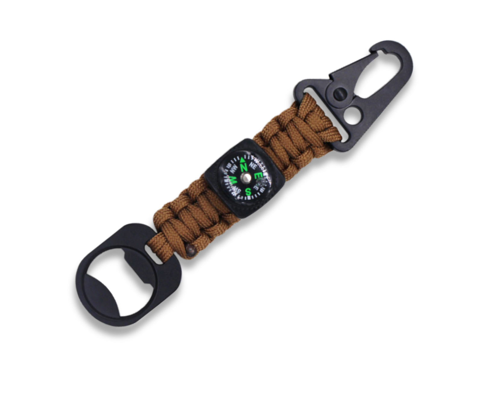 מחזיק מפתחות קומפקטי ורב-שימושי, המאגד בתוכו מספר פונקציות חיוניות לשטח או לשימוש יומיומי. כולל חבל פאראקורד חזק, מצפן מובנה לניווט בסיסי, פותחן בקבוקים מתכתי, וכן קליפס נשיאה המאפשר תפיסה קלה על תיק או חגורה.